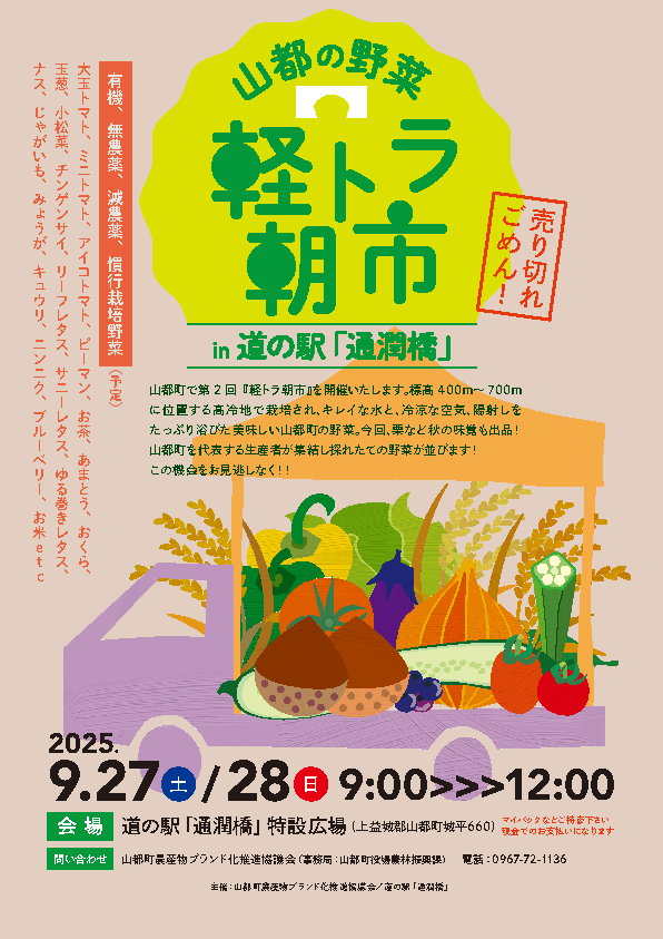 道の駅通潤橋で第2回『軽トラ朝市』が開催されます。標高400m~700mに位置する高冷地で栽培され、キレイな水と冷涼な空気、陽射しをたっぷり浴びた美味しい山都町の野菜。今回、栗など秋の味覚も出品。山都町を代表する生産者が集結し採れたての野菜が並びます!この機会をお見逃しなく!!